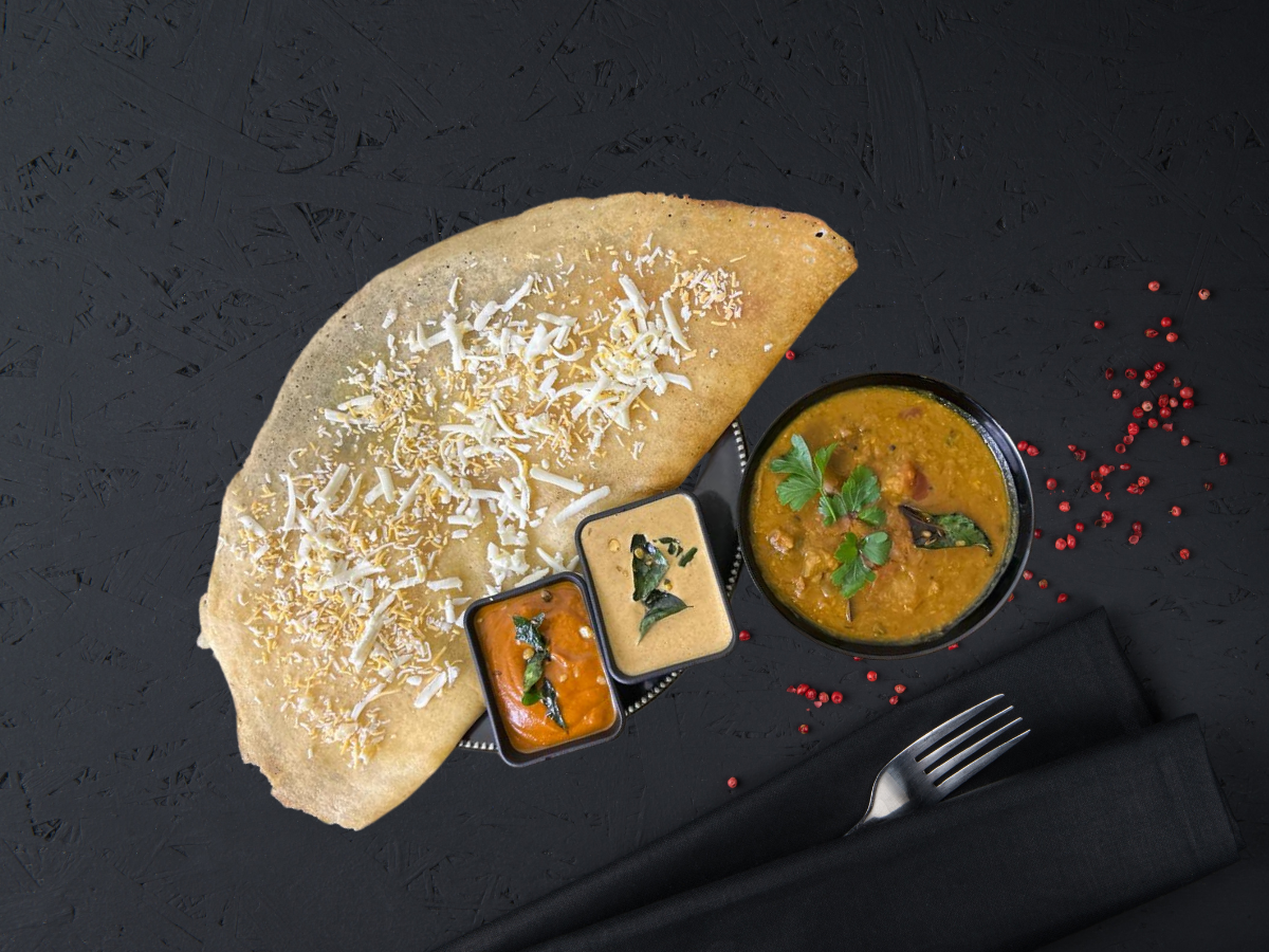 A fusion delight where the traditional South Indian dosa is layered with melted cheese, creating a delightful combination of crispy texture and gooey richness, often served with sambar and chutneys.